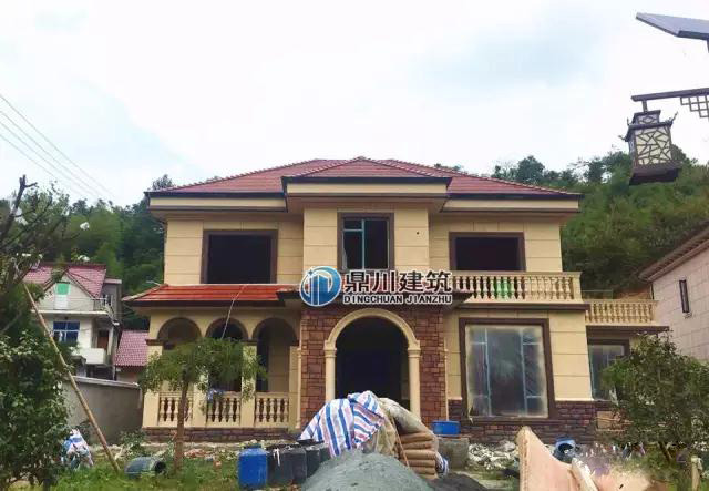 這是一款濃郁地中海風格的二層帶露臺農村別墅設計圖紙施工實拍。因為它濃郁的地中海風格特色,令人看過一眼便印象深刻,難以忘記,可以說在農村別墅中是很能輕易占有風頭的。這款別墅設計中仿古文化石和淺色系外墻的搭配給房屋增加了厚重感,首層的連廊、門樓、落地窗、二層的露臺都能感受到設計師對房屋設計的用心和追求。這個戶主在原設計的基礎上自己加了一個小地窖,從動工到建好,外墻基本粉飾完成總計花了38萬,也算經濟實用了。