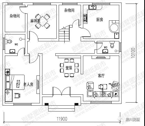一 層:堂屋、客廳、老人房(附衛生間)、麻將室(附雜物間)、雜物間、廚房(兼餐廳)、衛生間