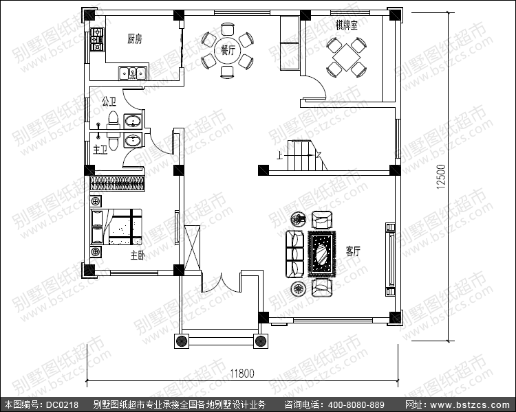 一 層:客廳(中空)、臥室(附衛生間)、棋牌室、廚房、餐廳、衛生間