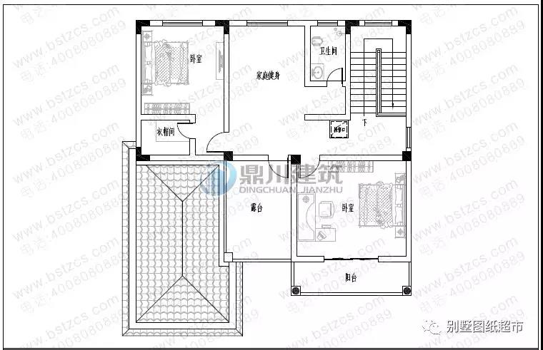 三層設健身廳、臥室(附衣帽間)、臥室(附陽臺)、衛生間、露臺,如果家里人不喜歡健身,可以改成棋牌室或者娛樂房,一家人其樂融融。