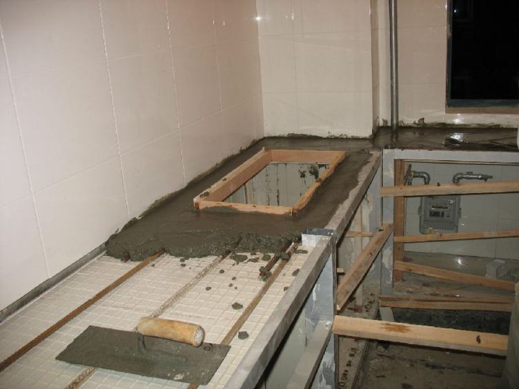 5、安裝臺面;建議在踢腳線處再加上瓷磚飾面,會更加美觀;踢腳線嵌入4公分;最后安裝柜門就完工了。
