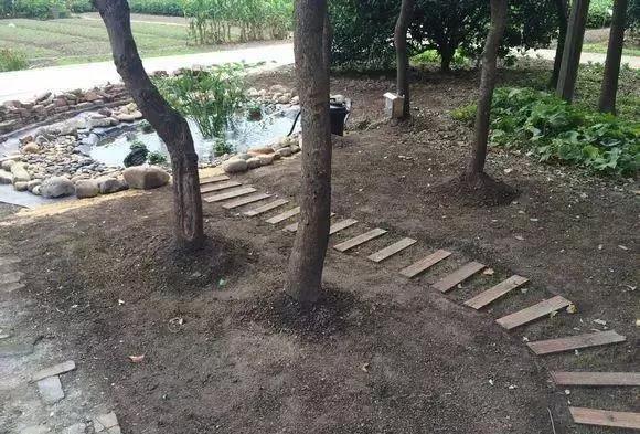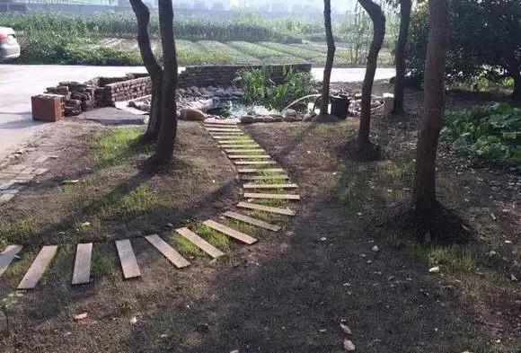 池塘與路之間弄了一條長的徑,準備沿著它來砌一面矮墻。