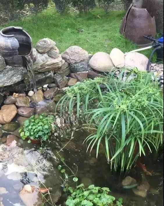 給池塘重新修整了一下,在石頭上放了一個缸做造型, 還不錯,又抓了二十幾條魚在池塘里。