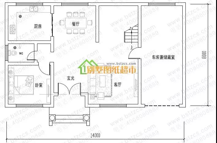 一 層: 客廳、臥室、廚房、餐廳、衛(wèi)生間、車庫(兼儲藏室)