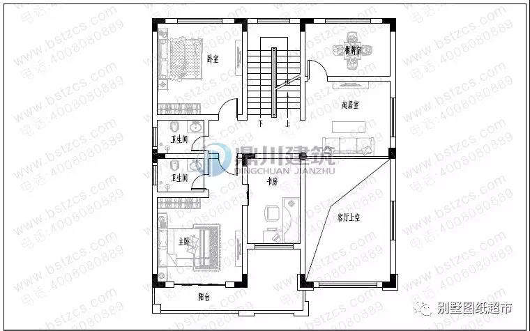 二 層:起居室、臥室(附書房,衛生間,陽臺)、臥室、棋牌室、衛生間