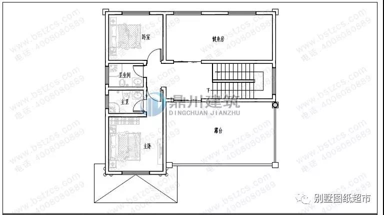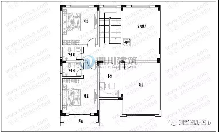 三 層:健身廳、臥室(附衛生間,露臺)、臥室、書房、衛生間、露臺