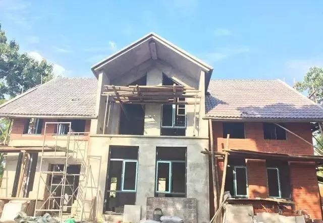 針對和頭像圖片相比比例不對的問題發現主要是中間的尖頂尺寸比原圖要大,原因是戶型設計完全是按自己需求設計的,沒有按原參考案例設計,另外窗戶大小等也根據當地情況進行了調整。沒有蓋瓦貼外墻磚之前很多當地鄉親說這什么破房子,怪里怪氣的,現在建得差不多了,能接受的人也慢慢多了