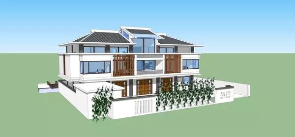 可以看到是個(gè) 3 層小樓,5 開間布局,場地西南角設(shè)小屋一間,圍墻全包圍,正前方為綠籬隔斷。