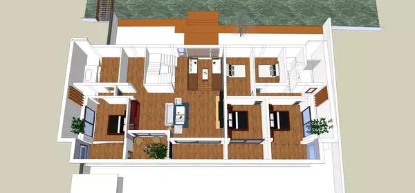 原本設(shè)計(jì)部分就可以在這里結(jié)束了,但老婆提出來說她希望有個(gè)閣樓,帶天窗的那種。我考慮了一下,通過對中間 6 米部分屋頂?shù)淖冃翁幚恚以谖蓓數(shù)谋眰?cè)拉出了一個(gè)露臺出來。具體布置可以看下面的圖。