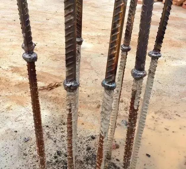 這種熱熔式的鋼筋接頭方式是業(yè)主專門找來的焊接工人用他們的三相焊接設(shè)備做的。它比傳統(tǒng)的搭接焊更牢固,理論上講,如果焊接合格,接頭的強度甚至優(yōu)于鋼筋本身的強度!