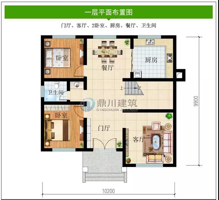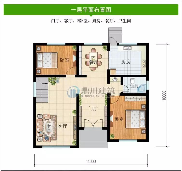 一 層:門廳、客廳、2臥室、廚房、餐廳、衛生間