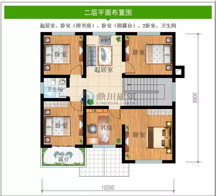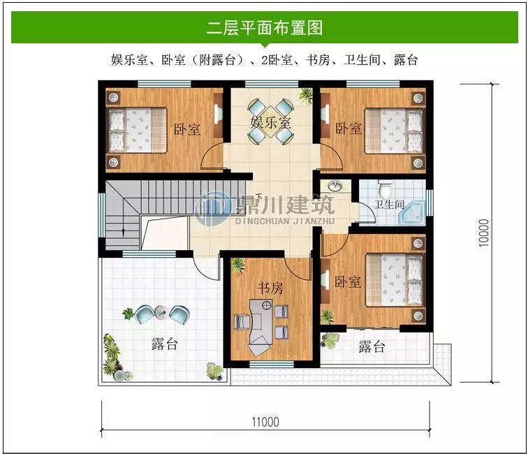 二 層:娛樂室、臥室(附露臺)、2臥室、書房、衛生間、露臺