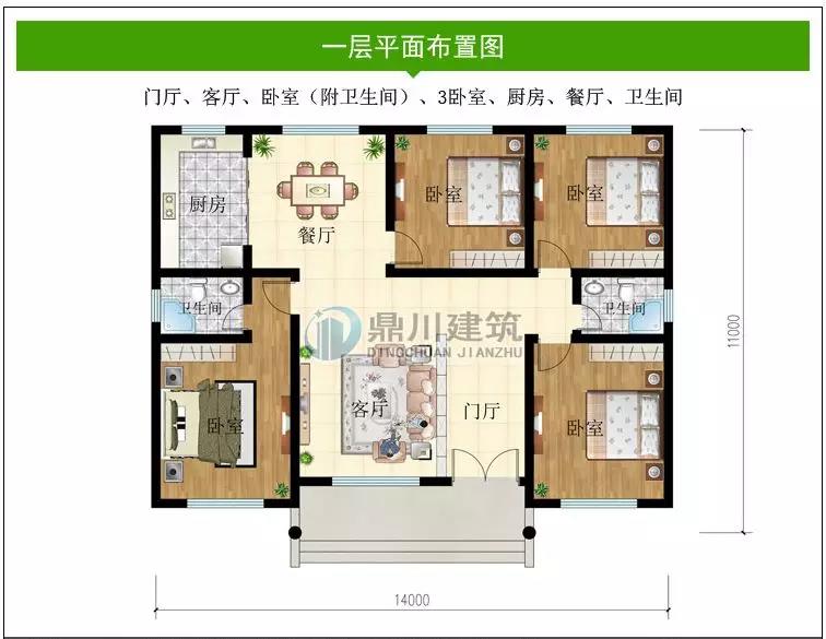 一 層:門廳、客廳、臥室、廚房、餐廳、衛生間