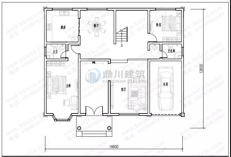 一 層:門廳、客廳、臥室(附衛生間)、臥室、廚房、餐廳、衛生間、車庫
