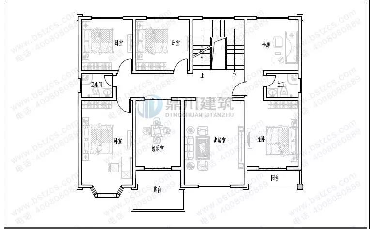 二 層:起居室(附陽臺)、娛樂室(附陽臺)、臥室(附衛生間)、3臥室、書房、衛生間