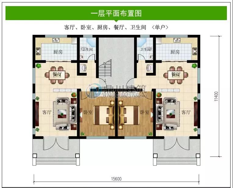 一 層:門廳、客廳、臥室(附衛生間)、臥室、廚房、餐廳、衛生間