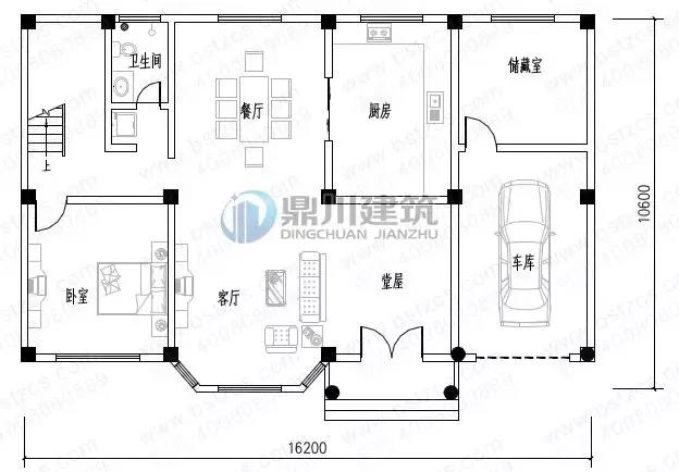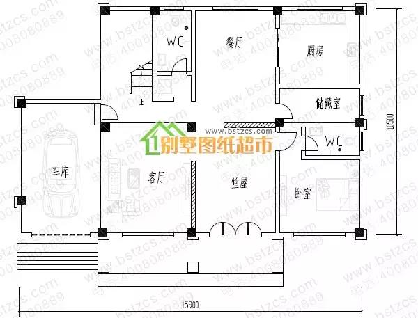 一 層: 堂屋、客廳、臥室(附衛生間)、廚房、餐廳、儲藏室、衛生間、車庫