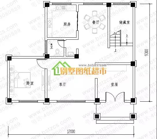 一 層: 走廊、堂屋、客廳、2臥室、廚房、餐廳、衛生間、儲藏室