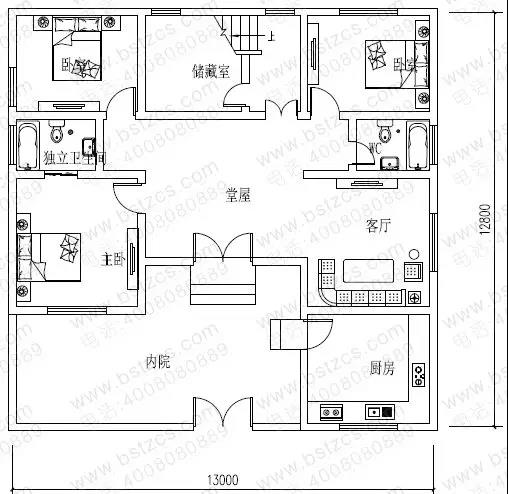 一 層: 內院、堂屋、客廳、臥室(附衛生間)、2臥室、廚房、儲藏室、衛生間