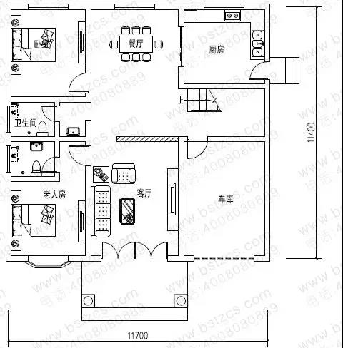 一 層: 客廳、臥室(附衛生間)、臥室、廚房、餐廳、衛生間、車庫