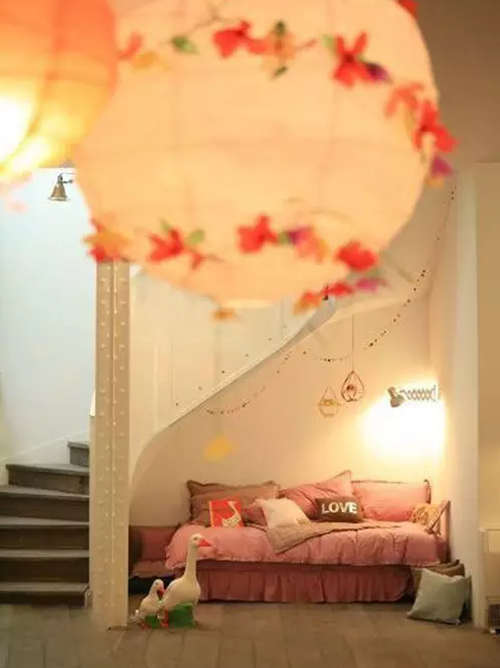 一盞暖黃色的燈將整個空間都渲染上了淡淡的暖意。紅色的沙發床帶來了優雅與可愛的氣息。樓梯下方的空間就想是一個小小的私密空間,不大但足夠讓整個人都在其間得到放松。