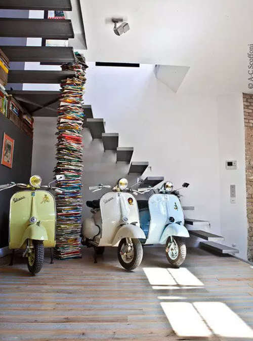 一級一級自成一體的臺階拼湊成了充滿創意的樓梯。扶搖直上很有騰云駕霧的感覺,下方空間中高高壘砌的書本估計也花費了主人不少心思。如此個性的設計當中摩托車停放車似乎也不錯啊!