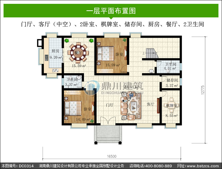 | 一 層: | 門廳、客廳(中空)、2臥室、棋牌室、儲存間、廚房、餐廳、2衛生間 | |||