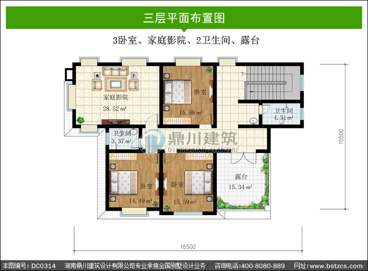 | 三 層: | 3臥室、家庭影院、2衛生間、露臺 | |||