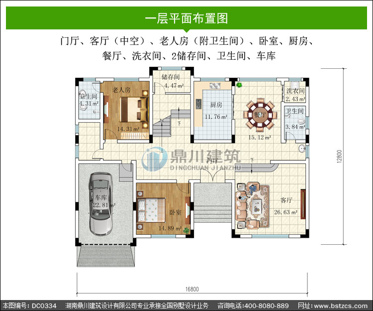 | 一 層: | 門廳、客廳(中空)、老人房(附衛生間)、臥室、廚房、餐廳、洗衣間、2儲存間、衛生間、車庫 | |||