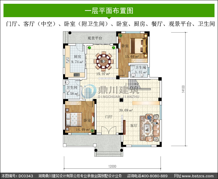| 一 層: | 門廳、客廳(中空)、臥室(附衛(wèi)生間)、臥室、廚房、餐廳、觀景平臺(tái)、衛(wèi)生間 | |||