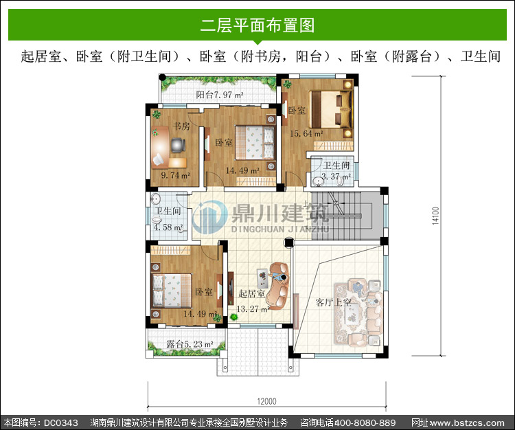 | 二 層: | 起居室、臥室(附衛(wèi)生間)、臥室(附書房,陽臺(tái))、臥室(附露臺(tái))、衛(wèi)生間 | |||