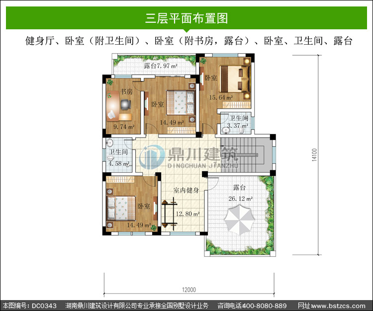 | 三 層: | 健身廳、臥室(附衛(wèi)生間)、臥室(附書房,露臺(tái))、臥室、衛(wèi)生間、露臺(tái) | |||