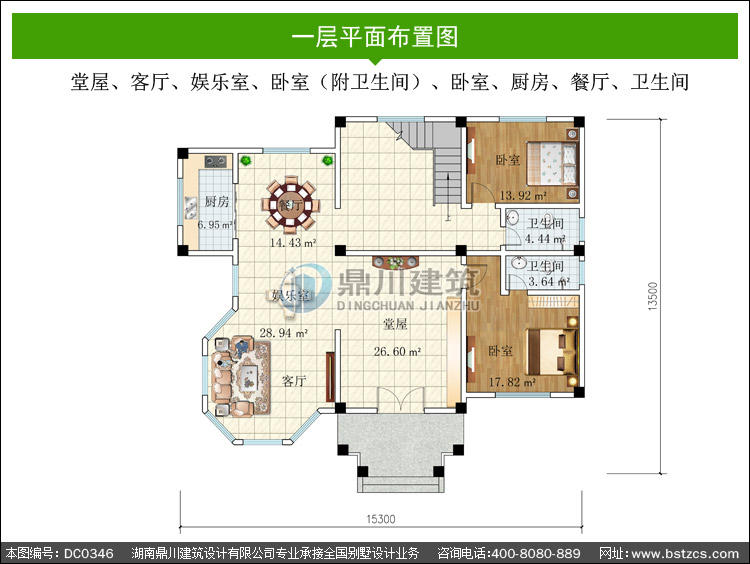| 一 層: | 堂屋、客廳、娛樂室、臥室(附衛(wèi)生間)、臥室、廚房、餐廳、衛(wèi)生間 | |||