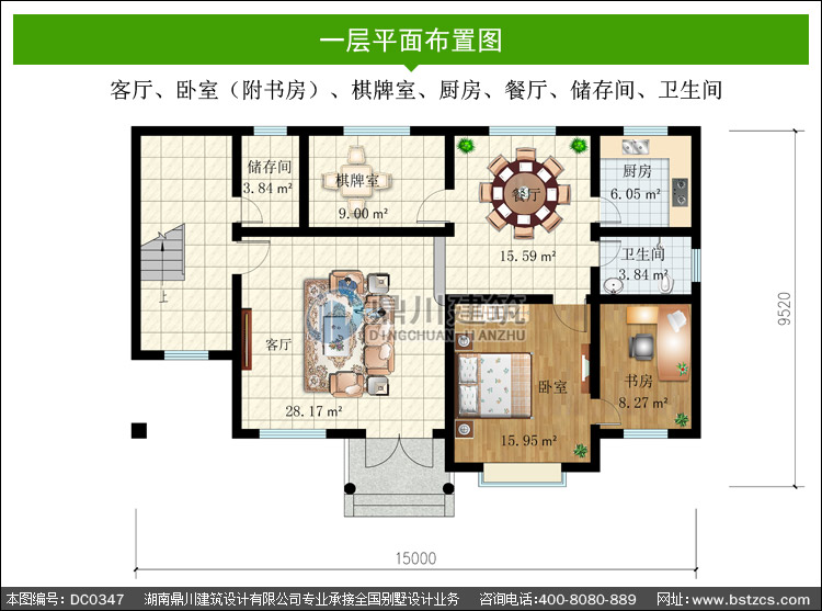 | 一 層: | 客廳、臥室(附書房)、棋牌室、廚房、餐廳、儲存間、衛生間 | |||