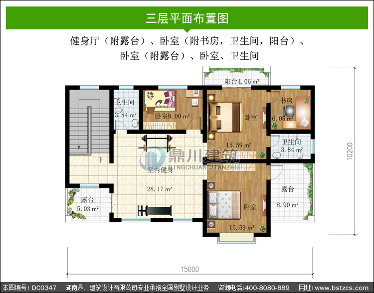 | 三 層: | 健身廳(附露臺)、臥室(附書房,衛生間,陽臺)、臥室(附露臺)、臥室、衛生間 | |||