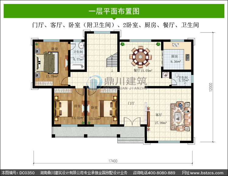 | 一 層: | 門廳、客廳、臥室(附衛生間)、2臥室、廚房、餐廳、衛生間 | |||