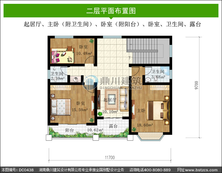| 二 層: | 起居廳、主臥(附衛生間)、臥室(附陽臺)、臥室、衛生間、露臺 | |||